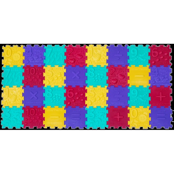 Крім масажу стоп, за допомогою пазлів ви зможете вчити дітей рахувати, складати приклади. Кількість овочів та фруктів відповідає цифрі на елементі – це допоможе в рахунку та приверне увагу дитини.