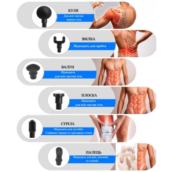 Кругла насадка: Відмінно підходить для масажу плечей, спини, талії, стегон, бедер, гомілок та великих м'язових груп.