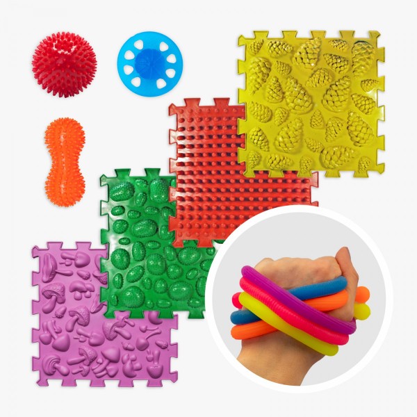 Склад набору розрахований на різноманітну дію на сенсорну систему. Дитина ходить босоніж ортопедичними пазлами, катає стопами або долонями масажний м'яч, розтягує і стискає еспандер, перебирає пальчиками гумки з різною текстурою, зав'язує і розв'язує їх. Таким чином, здійснюється комплексне тренування та розвиток сприйняття. Крім того, це цікава та корисна гра, яка відверне дитину від мультиків та гаджетів ;)